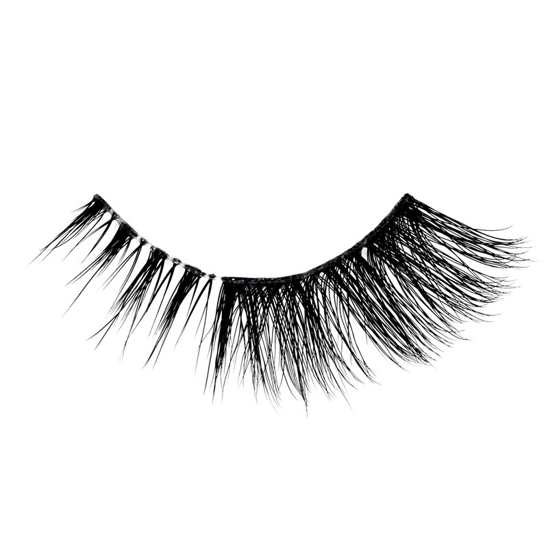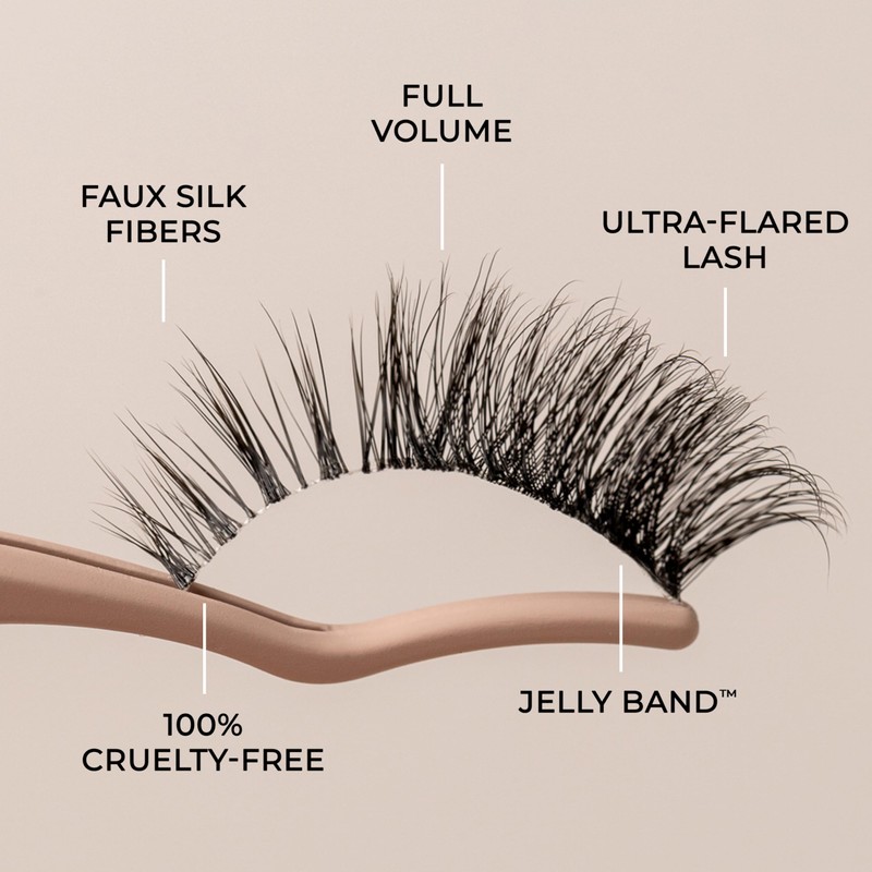 A weightless, flexible, and customizable lash woven on a flexible Jelly Band to seamlessly fit your lash line for all-day wear. Delicately spiked inner corners and ultra-flared outer corners create a wispy full-volume cat eye look. These easy-to-apply false lashes are made with 100% Cruelty-Free Faux Silk Fibers to give you long-lasting and comfortable wear all day long. 3D fibers weaved throughout enhance and sculpt your natural lash. Each may be reused up to 15+ times.