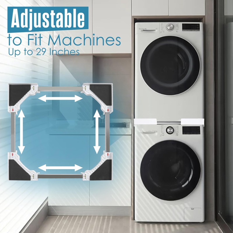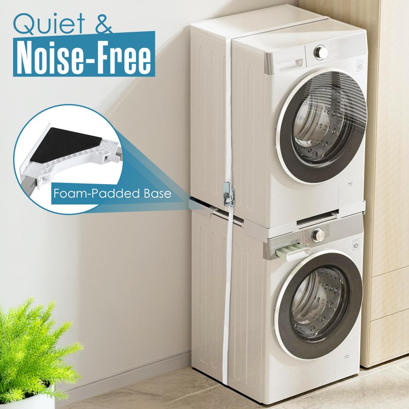 This stackable washer and dryer kit is designed to help you maximize space by securely stacking your washer and dryer. This stack washer and dryer offers an adjustable bracket that fits most household machines up to 29 inches, ensuring compatibility with a variety of front-load washers and dryers for a secure, space-saving setup. The universal stacking kit for washer and dryer comes complete with everything needed for installation—including a heavy-duty ratchet strap and extra foam pads—so no additional tools or parts are necessary, making the process hassle-free. This washer dryer stacking kit universal is designed for stability. The ratchet strap and adjustable bracket keep appliances firmly in place, while the anti-slip foam padding absorbs vibrations to reduce noise and prevent movement. With clear instructions and user-friendly components, stacking your machines is quick and simple, allowing you to create extra room effortlessly with our washer dryer stack.