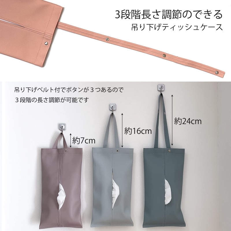 - Fashionable leather style tissue case for hanging: Simple design that fits in a wide variety of rooms. High-quality synthetic leather (PU leather) quickly wipes away dirt. In addition to tissues, it can also be used for kitchen paper, mask, etc