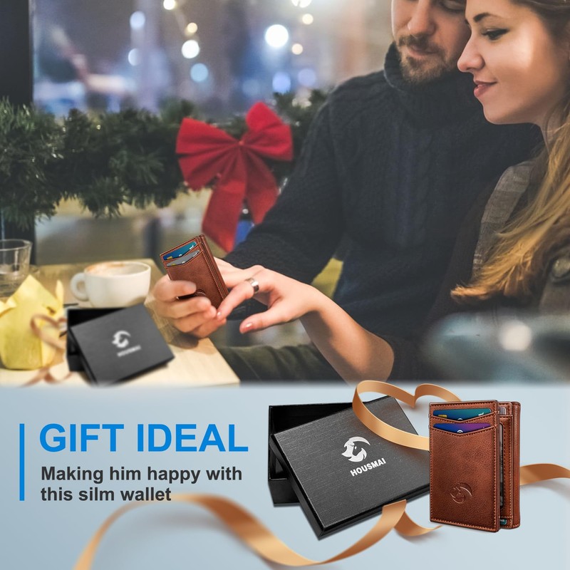 Housmai Trifold Leather Wallet for Men,with Cash Pocket 2 ID Window 14-16 Cards Magnetic Closure Slim Wallet 4.0"*3.1", RFID Blocking Front Pocket Wallet with Gift Box