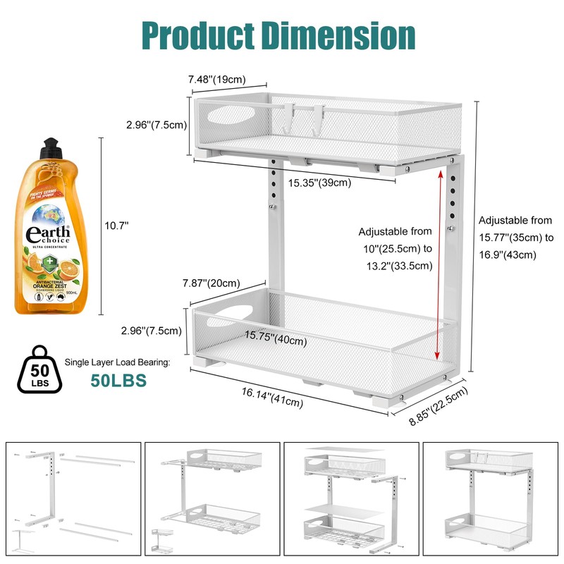 • 【2-Tier Pull out Stoppable Drawer】 The under sink organizer has 2 tiers of pull-out mesh drawer for easy access to items under sink. Stopper at the bottom prevents pulling out completely and items from slipping out.