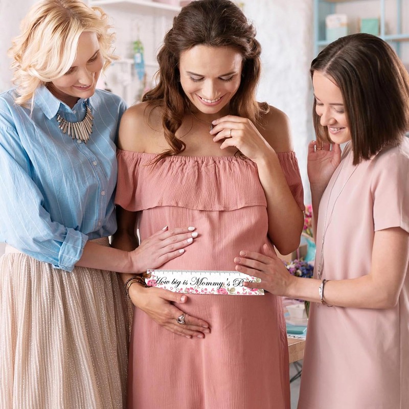 - A measuring tape baby shower with pink flowers as the theme, printed with the words "How Big Is Mommy's Belly" and exquisite floral patterns. This baby shower paper measuring tape is perfect for baby shower games, parties, and baby watering events. You can measure the belly of different mothers at different times and write their names and time on a ruler.