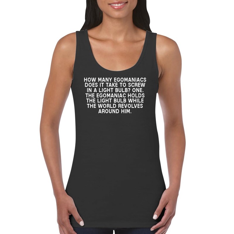 How Many Egomaniacs Does It Take to Screw in A Light Bulb? One. The Egomaniac Holds The Light Bulb While The World Revolves Around Him. - Women's Soft Cotton Tank Top CP05 Black