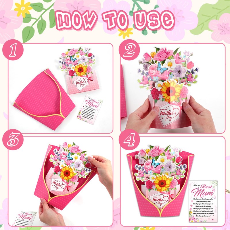 - 3D & Pop-Up Mother's Day Card: You will receive one Happy Mother's Day Pop-Up Flower Bouquet Card, complete with a small card for Mum, perfectly suited for your Mother's Day needs. This beautiful keepsake card is ideal for celebrating this special occasion.