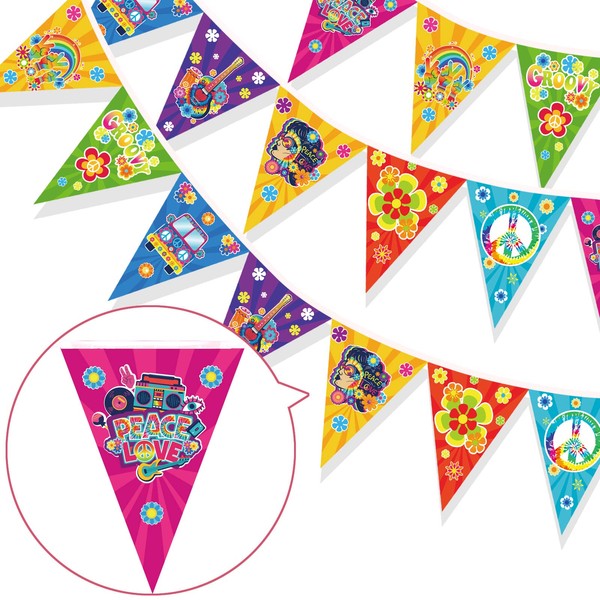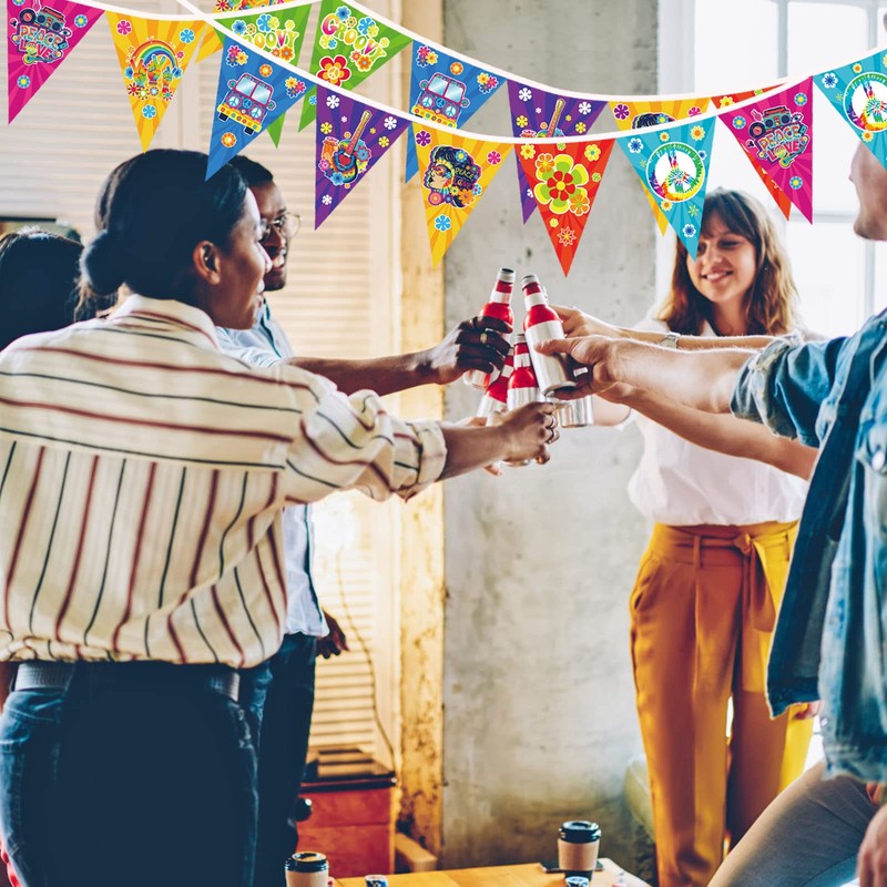 - Quality Material These 60s groovy party retro banners are made of high quality cardstock, double sided printed. They are durable enough to be applied many times on different occasions, the colour can last for a long time. The hippie pennant banner comes pre-strung, no need to DIY which are easy to hang due to their light weight.