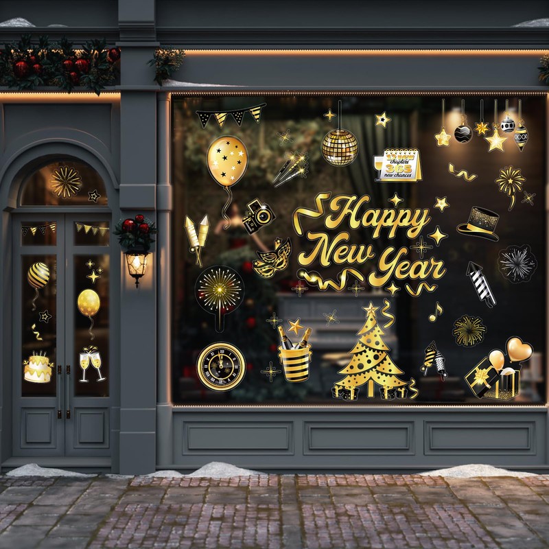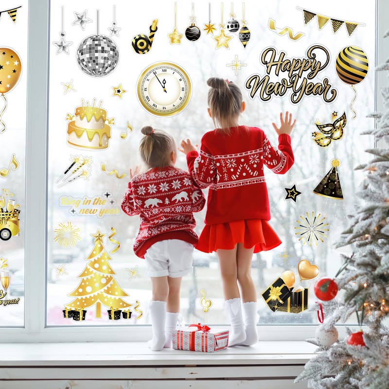 - New Year Eve Party Themed Design: 2025 new year party window clings design with festive confetti, beautiful firework, new year hanging ball, hanging star, shining disco ball, floating balloons which will make year new year window glass vivid and attractive! New Year window decorations stickers sheets also have new year dancing mask, big new year gift boxes, gorgeous new year trunk, new year top hats, new year camera, new year jumping people, new year countdown clock, new year wine bottle, new year champagne glass, microphone, new year cake, adorn your windows and transfer your home a festive new year eve wonderland.