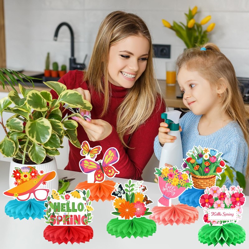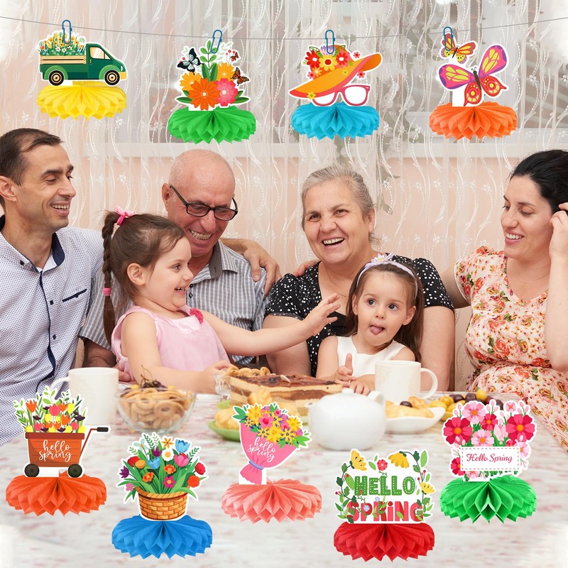 - Colorful and Bright: colorful honeycomb centerpiece for Spring design with beautiful rose flower, printed with Hello Spring, Butterfly,Bouquet, put these Spring supplies on table, book self, car and anywhere you want to decor!