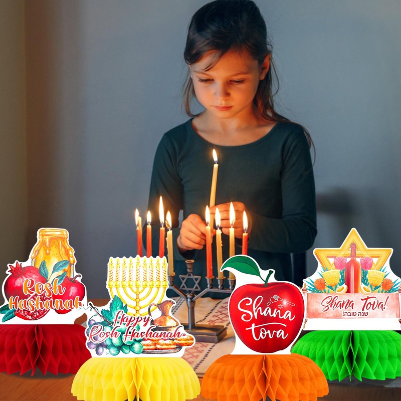• Classic Jewish New Year Shana Tova Decor Design: Shanah Tovah! Wish you all a sweet new year! Rosh Hashanah table decorations paper centerpieces designed with honey, shofar horn, leaf patterns, pomegranate, seven menorah, fruit and other festive themed elements related to Jewish New Year, these Jewish New Year decorations honeycomb centerpieces will add a good feel and a special touch to your Jewish Holiday!