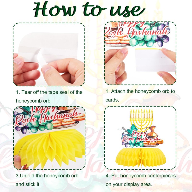 • Easy to Assemble: Happy Shanah Tovah table centerpieces are very easy to put together; First, you need to find the sticker of the honeycomb ball and tear it off, then pull, rotate and stick to the other side, repeat it on the opposite side, finally you can fan out the base; It will be a happy time to assemble these Jewish Holiday Jewish new year table centerpieces with your family!