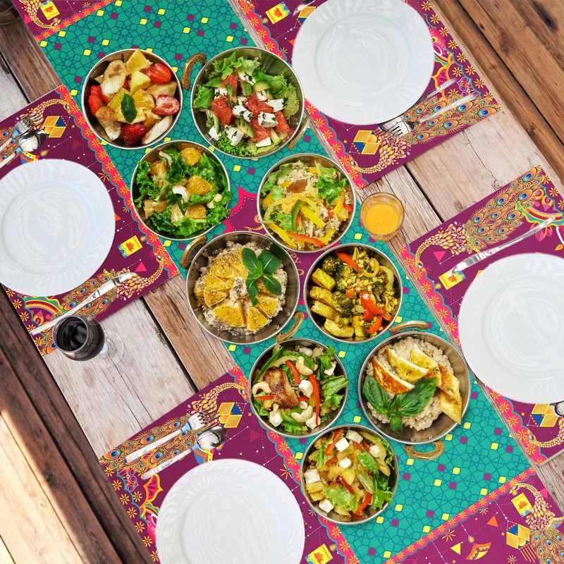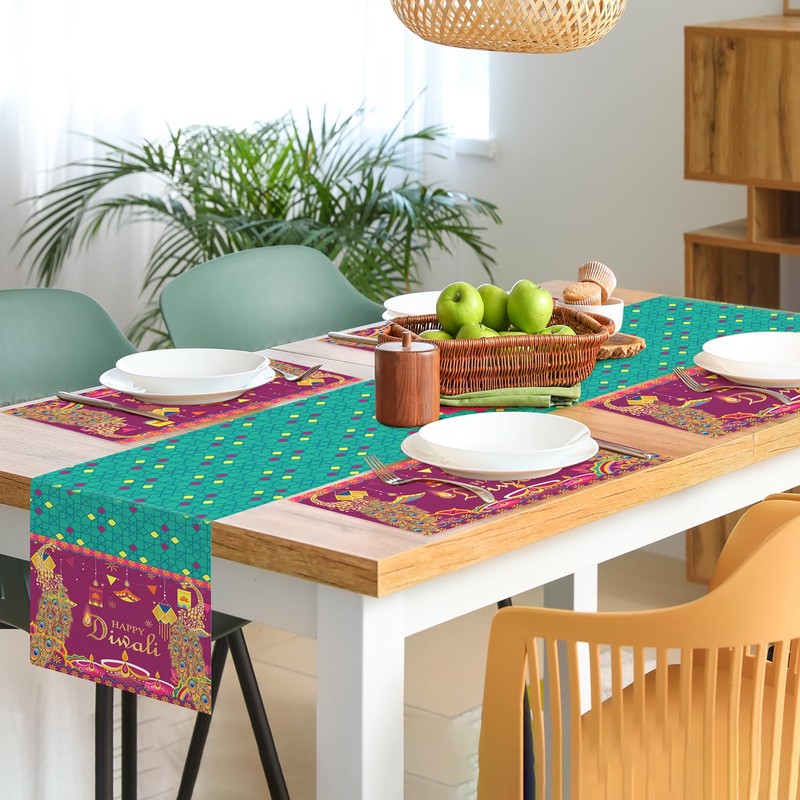- Happy Diwali Table Decorations Set: 1 Pcs Diwali Diya Table Runner measures 16" x 71" (40 x 180 cm) with 4pcs Indian Happy Diwali Placemats, each Deepavali Table Place Mats measures 12" x 18" (30 x 45 cm), Indian festive Diwali dining table set of 6 fits table that can seat 4 people, make your Indian Deepavali Festival Holiday Kitchen Dining full of festive atmosphere.