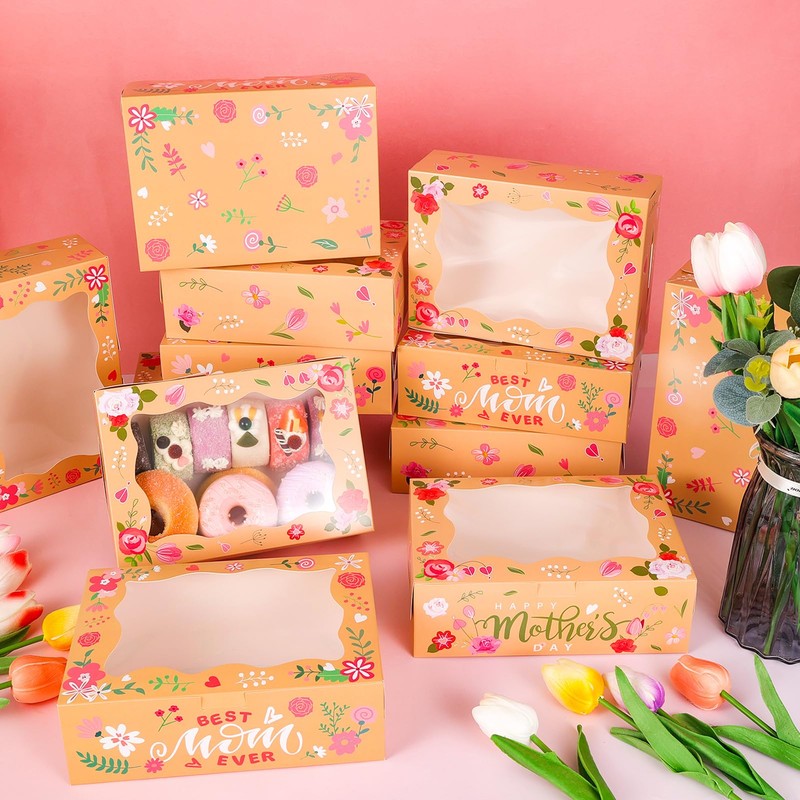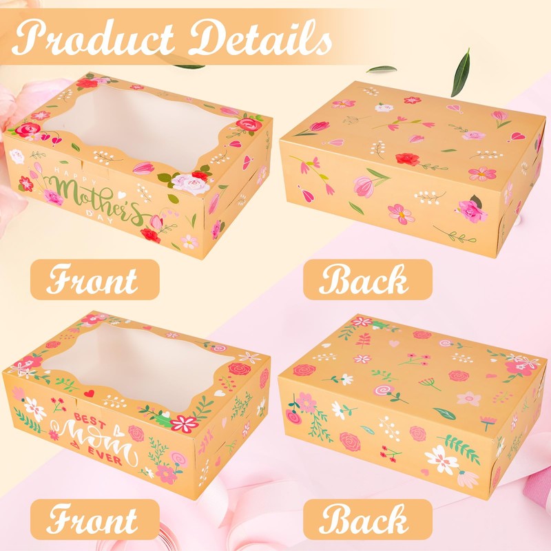 - Exquisite Mother's Day Design: The bakery boxes is designed as the main Mother's Day pattern, divided into 2 styles, each style has different shapes of Mother's Day pattern and word. Besides, the difference with other gift boxes is that the center of the box is designed with a transparent display window, which allows others to preview the desserts or gifts inside the box.