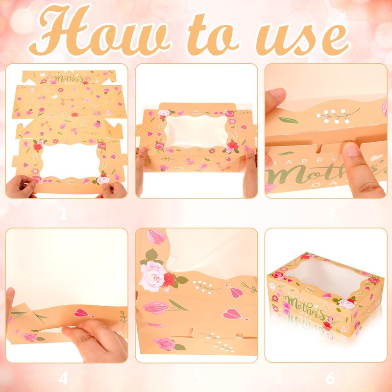 - Simple Assemble are Needed: Mother's Day party paper treat boxes are easy to assemble by folding in the flaps, can press the sides, please refer to the picture for assemble steps. You can pack flat the Mother's Day bakery boxes for convenient storage when not in use, reusable and recyclable!