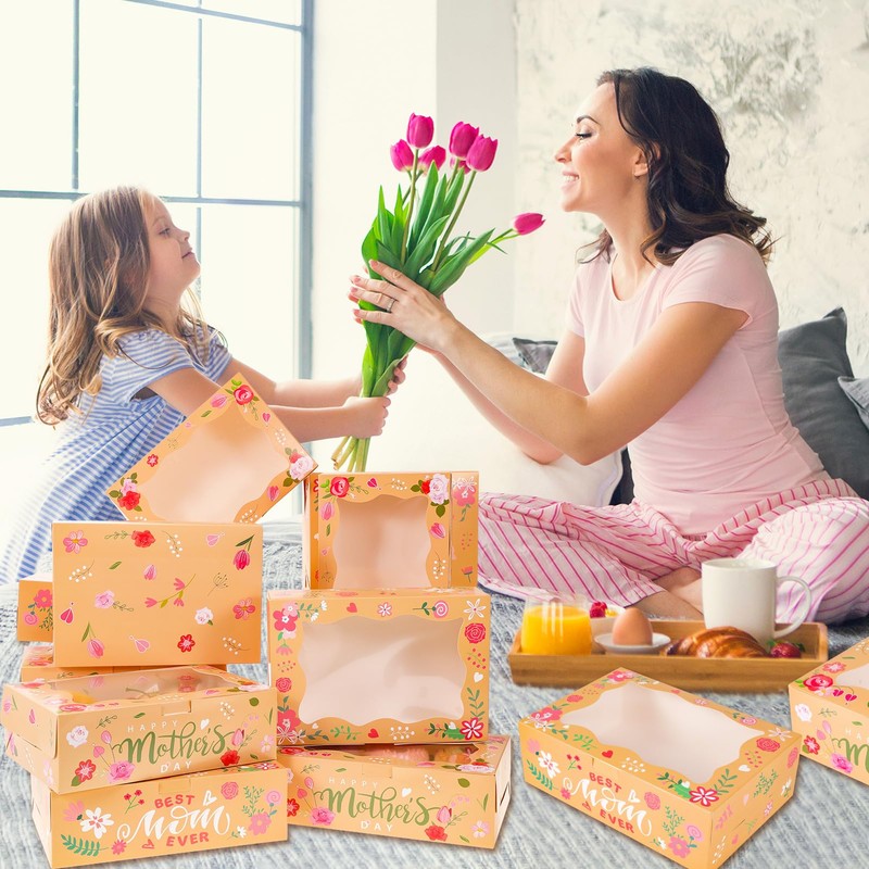 - Mother's Day Treat Boxes with Transparent Window Set: You will receive 12 Mother's Day gift boxes. They are of 2 different styles, 6 boxes included for each style. Each Mother's Day treat box has a transparent display window that allows your friends or family to preview the beautiful gifts or tasty treats inside the box.