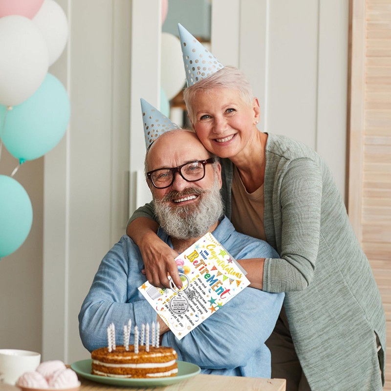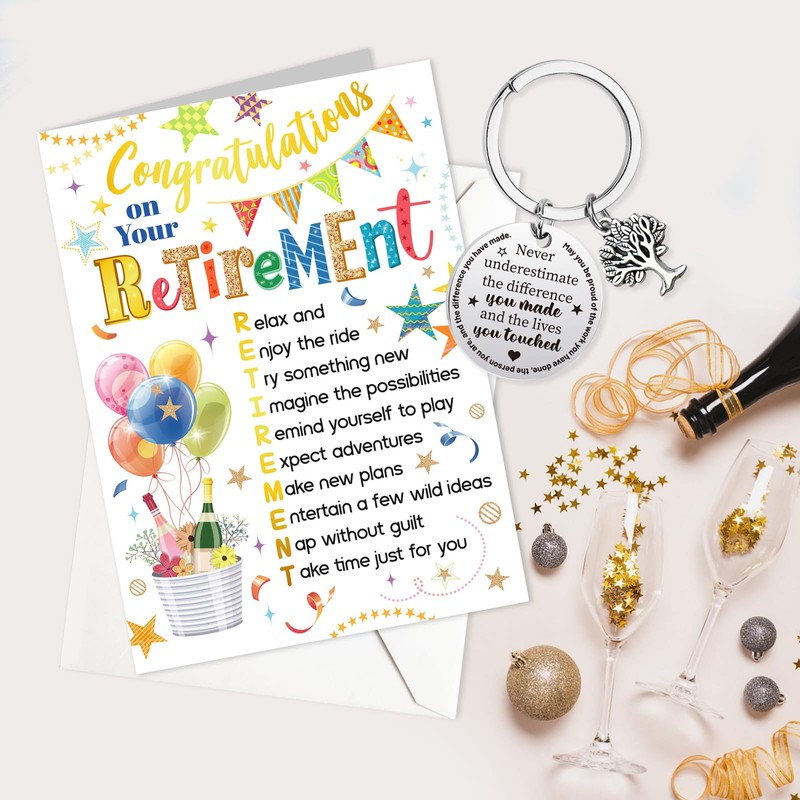 - Buy With Confidence: It will definitely add more fun to retirement party Celebrations ! Any problem just contact us about Retirement Card for Men Women with Retirement Keyring. More Retirement Accessories, Retirement Balloons, Retirement sash, Retirement banner,Retirement gifts, etc. please visit Howaf storefront.