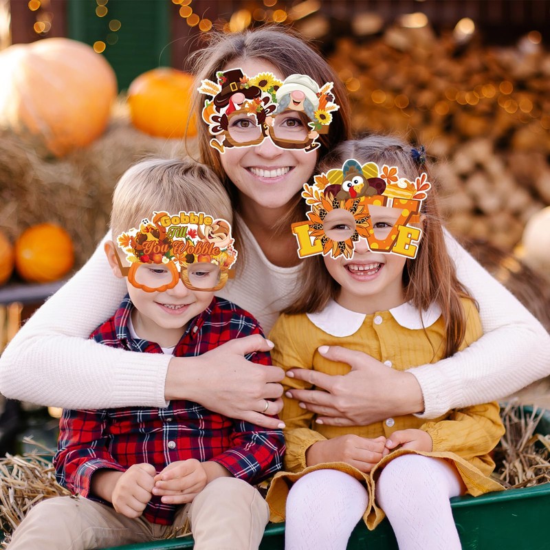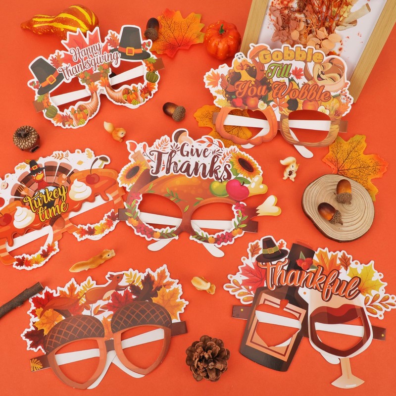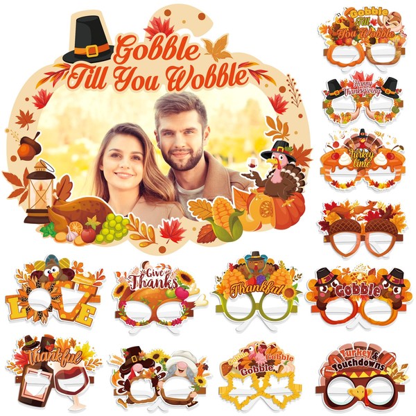 - Thanksgiving Party Decor Favors Include: You will receive 12 pcs of funny Thanksgiving eyeglasses in 12 styles designs, a piece of Gobble Pumpkin paper photo frame. Thanksgiving day photo frame and pumpkin glasses mask printed part is dust and splash proof to some extent.