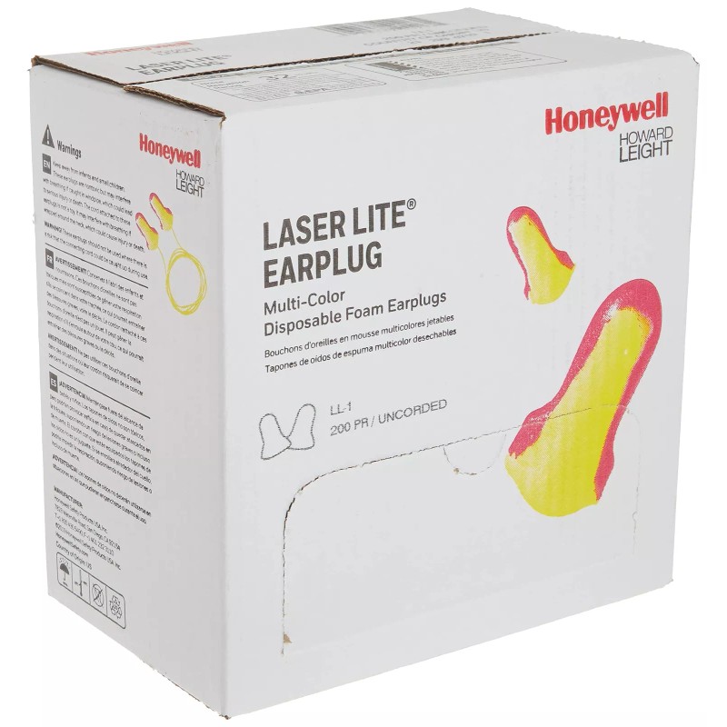 Confirm at a glance that employees and colleagues are wearing ear protection with Howard Leight by Honeywell Laser Lite High Visibility Disposable Foam Earplugs. The yellow and magenta color scheme ensure these foam earplugs stand out, even across a busy shop floor. The contoured T-shape makes for easy insertion and removal, and the self-adjusting foam is designed to fit most ear canals. Workplace dirt buildup is inhibited by the soil-resistant, closed-cell foam skin. 200 pairs of disposable earplugs per pack.