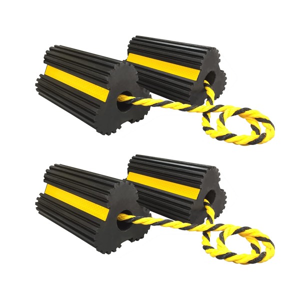 HOXWELL 2 Pair Rubber Heavy Duty Dual Wheel Chocks Front and Back, RV Leveling Blocks Non Slip Base with Nylon Rope Yellow Reflective Tape for Travel Trailers, Car, Camper, Truck (4 Pack)