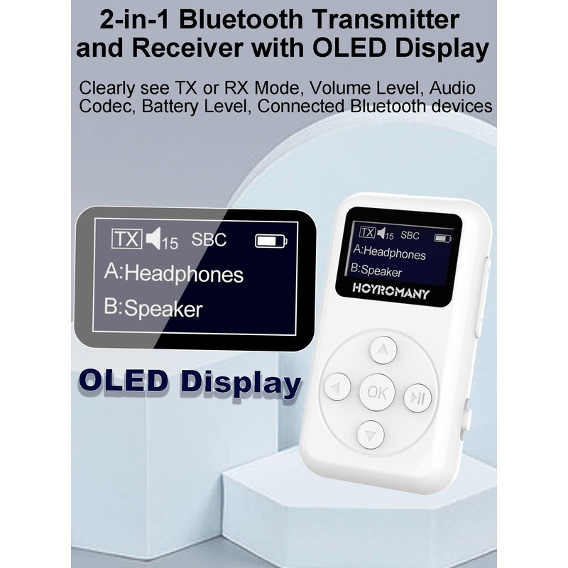 - OLED Display: Bluetooth transmitter for airplane with OLED display, Can intuitively display the transmitter or receiver mode, volume level, Audio Codec, battery level, connected Bluetooth devices