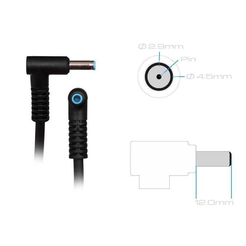 - Connector type: barrel plug blue, outer diameter of the connector: 4.5 mm, inner diameter of the connector: 2.9 mm, length of the connector: 12.0 mm, pin in the connector: yes, length of the connection cable from the power supply to the notebook: approx. 1.75 m