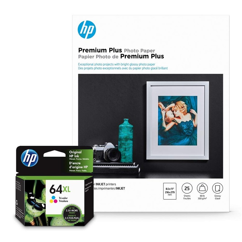 HP 64XL Tri-Color Inks + HP Premium Plus Photo Paper, Glossy, 25 Sheets, 8.5x11