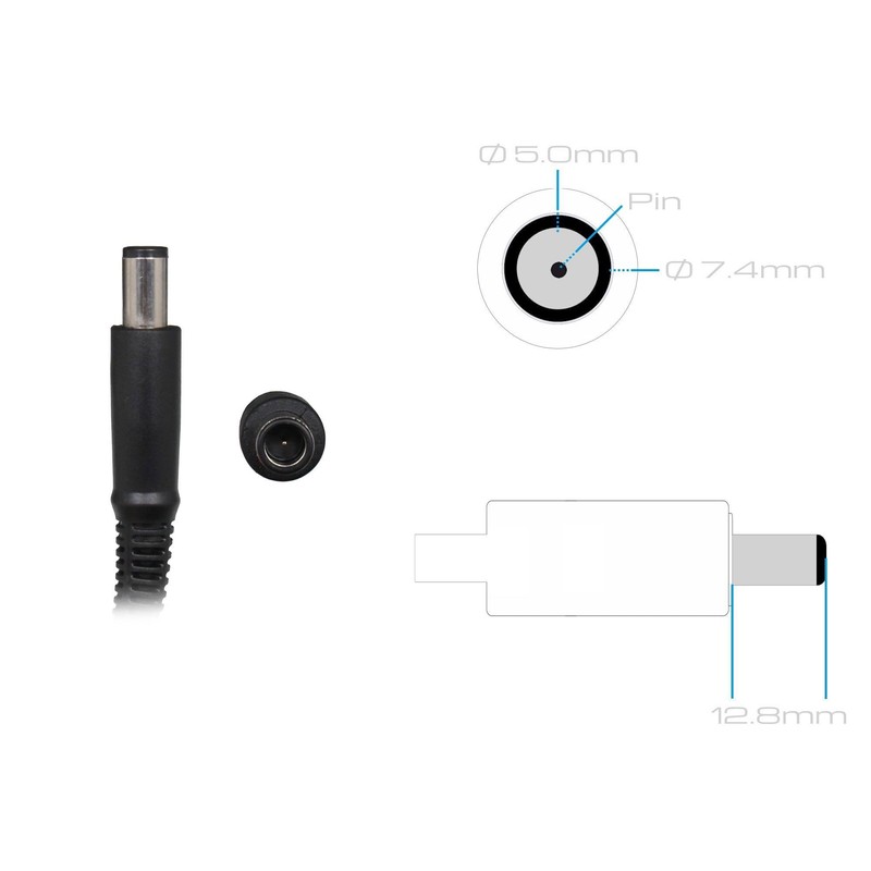 - Plug type: round, connector shape: 180° straight, outer diameter of the connector: 7.4 mm, inner diameter of the connector: 5.0 mm, length of the connector: 12.8 mm, pin in the connector: yes, length of the connection cable from the power supply to the notebook: approx. 1.70 m