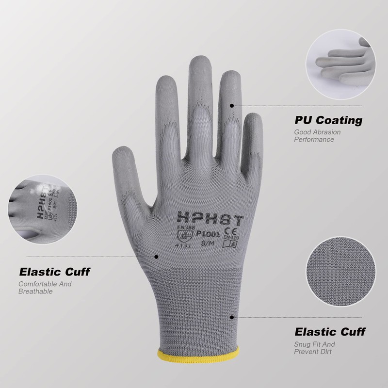 HPHST PU Coated Safety Work Gloves, 12 Pairs Work Gloves Polyurethane Coated Smooth Excellent Grip on Palm&Fingers - Grey (L)