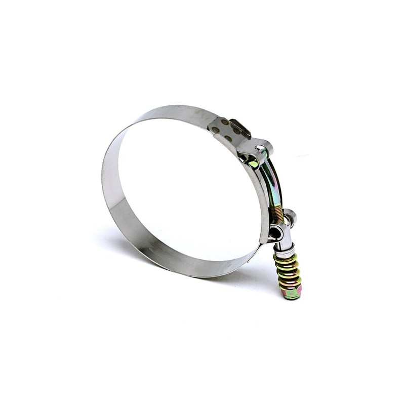 HPS Stainless Steel Spring Loaded T-Bolt Clamp 7.25"-7.56" (184mm-192mm) for 7" inch ID hose provides high strength and a 360 degree seal. The added spring is there to automatically adjusts the clamp diameter to compensate for the expansion and contraction of hose when temperatures or the pressure fluctuate. HPS spring loaded clamps are reusable. Design to meet or exceeds SAE Spec. J1508 for T-bolt clamps. The clamps has a floating bridge and rolled edges to protect soft hose. The lock nut has a nylon insert to prevent it from backing out. Tighten with a 7/16 inch socket wrench. The HPS constant tension t bolt clamps are widely used in the charge air cooler system (cac), aircraft, automotive, truck and heavy-duty vehicle, industrial, hardware/plumbing, and marine industries. Technical Specification: SAE #204. Effective Size Range: 7.25"-7.56" (184mm-192mm). Superior welded construction. Floating bridge and rolled edges to protect soft hoses. 3/4 inch wide 300 Series Stainless Steel Band and Trunnion. Zinc Plated T-bolt, Nut and Springs. 7/16 inch head Nylon Nut. Meets or exceeds SAE Spec. J1508 for T-Bolt clamps. Max. Torque Spec: 75 in. lbs. Quantity: 1.