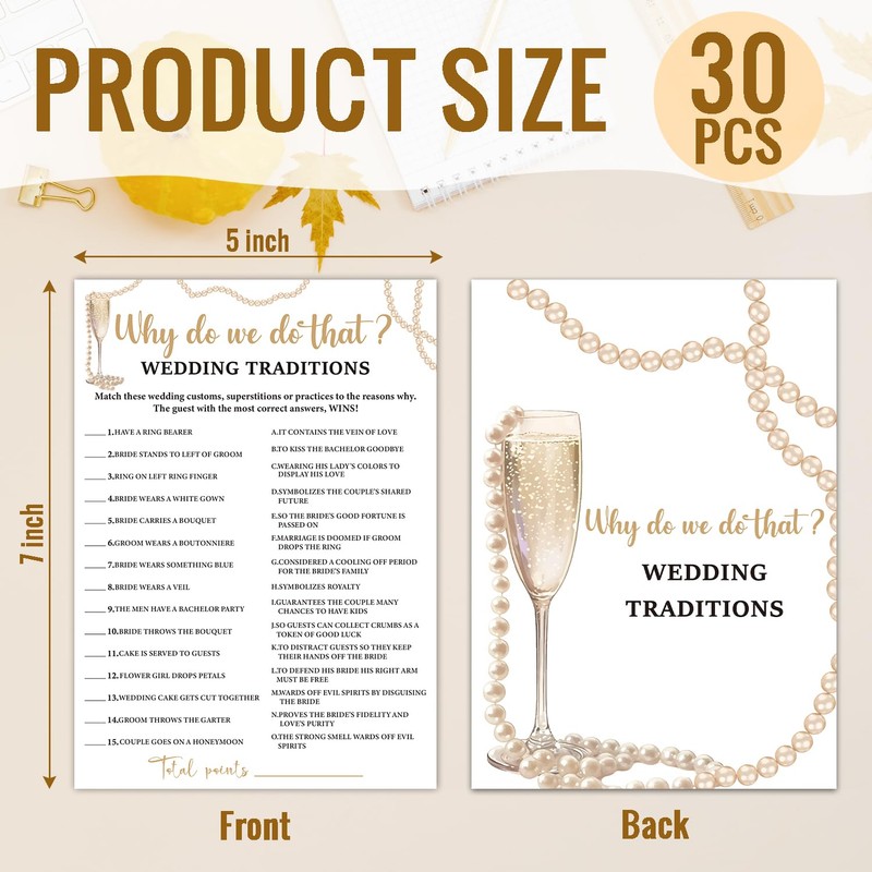 - Card size: You will receive 5 x 7 inch game cards. Each set of game cards contains 30 cards, which can allow 30 guests to experience interesting wedding games.