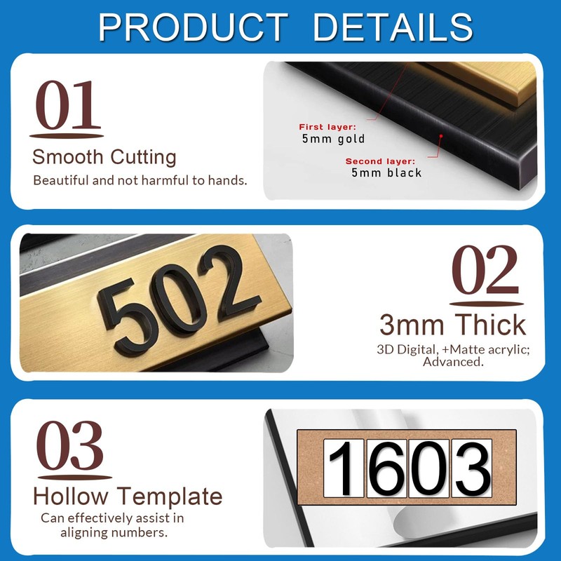 - 🔨 JUST STICK AND INSTALL: There's glue on the back of the numbers and the house number plaque. First, peel off the paper on the back of the numbers and stick them on the plaque. Then peel off the paper on the back of the plaque and stick it where you want. But be careful, once the numbers are stuck, they're hard to take off.