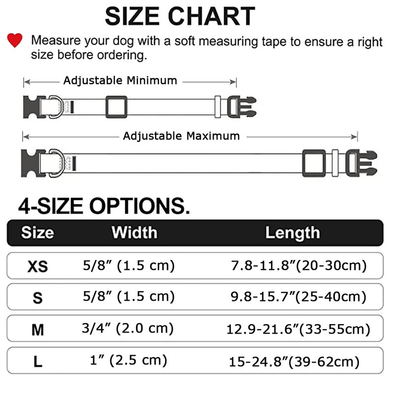 - Note: All pictures were taken with our production samples from a size of L (width 1.5 cm, neck 38-109 cm). Please measure your pets carefully to make a safe and suitable purchase. Always refer to the size chart for the recommended weight range to confirm the size.