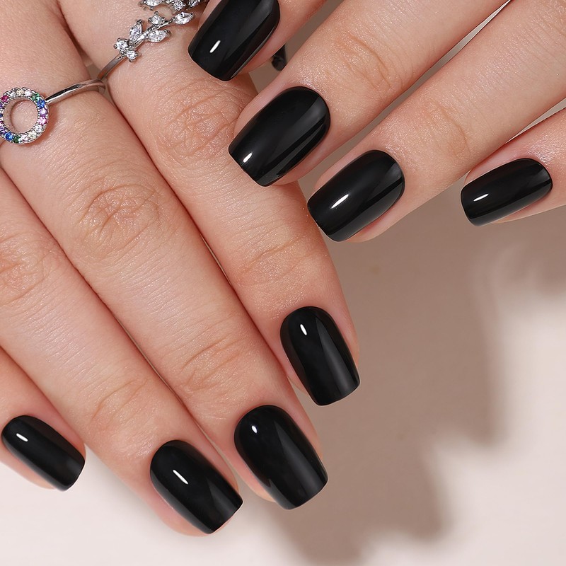 Hrnsnails Black Press On Nails, Short Square Press On Nails,Glue On Nails Short Fake Nails with Glossy Designs, Nails Press Ons Reusable Soft Gel False Nails,Artificial Nails Stick On Nails for Women