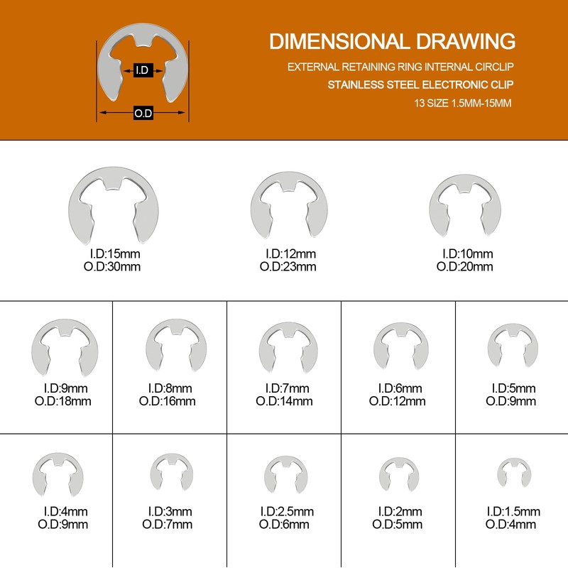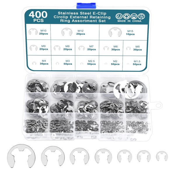 - Size: Package contains M1.5-M15, 13 sizes E-clip ring, total 400 pieces.