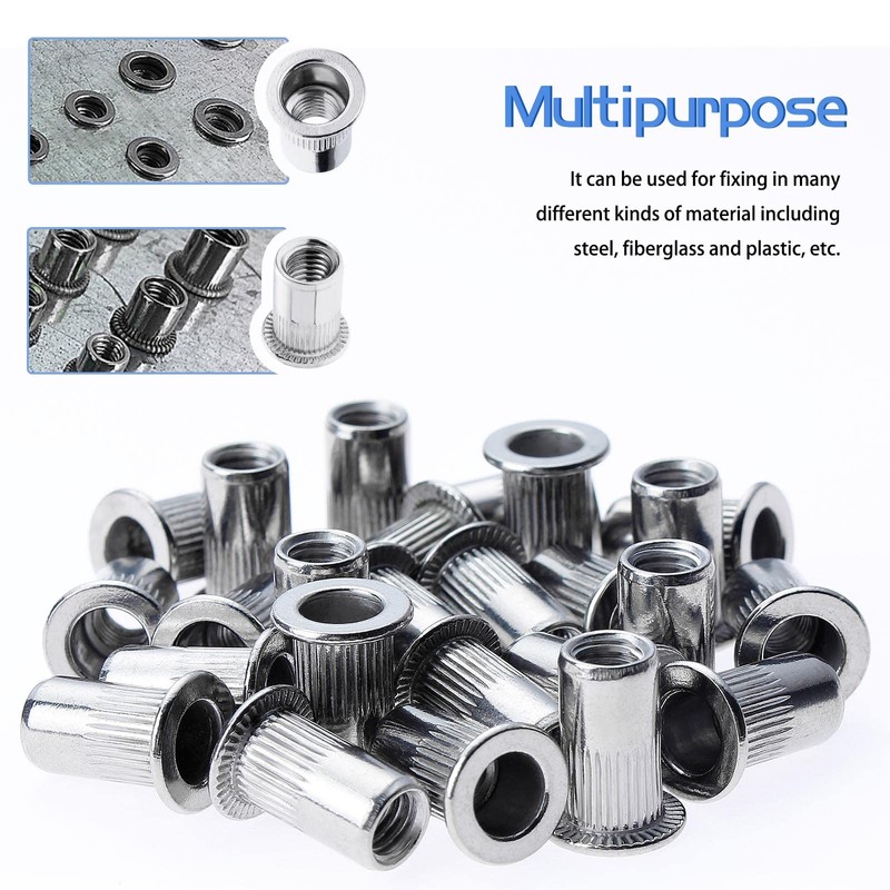 - ✔️【Easy to Use】:The threaded rivet inserts are easy to install, has good friction and bite force,Can be easily installed in many different kinds of material including steel, plastic and fiberglass. Just drill a hole according to the size of the rivet nut mounting hole, insert the rivet nut, and tighten the locking nut with the rivet tool.