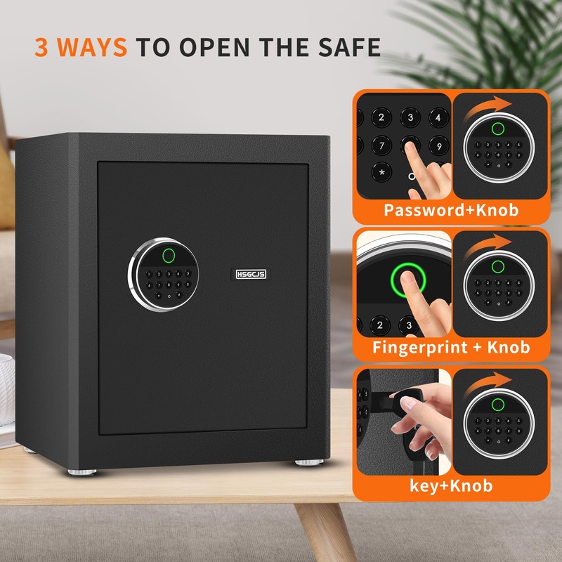 • [NEW SAFE EXPERIENCE] HSGCJS biometric fingerprint safe has a storage space of 1.93 cubic feet and an adjustable shelf to provide you with more flexible storage space. The home safe is equipped with LED lights inside, allowing you to quickly find what you need in the dark. In addition, the interior of the fingerprint safe is covered with velvet to prevent valuables from being scratched or damaged.