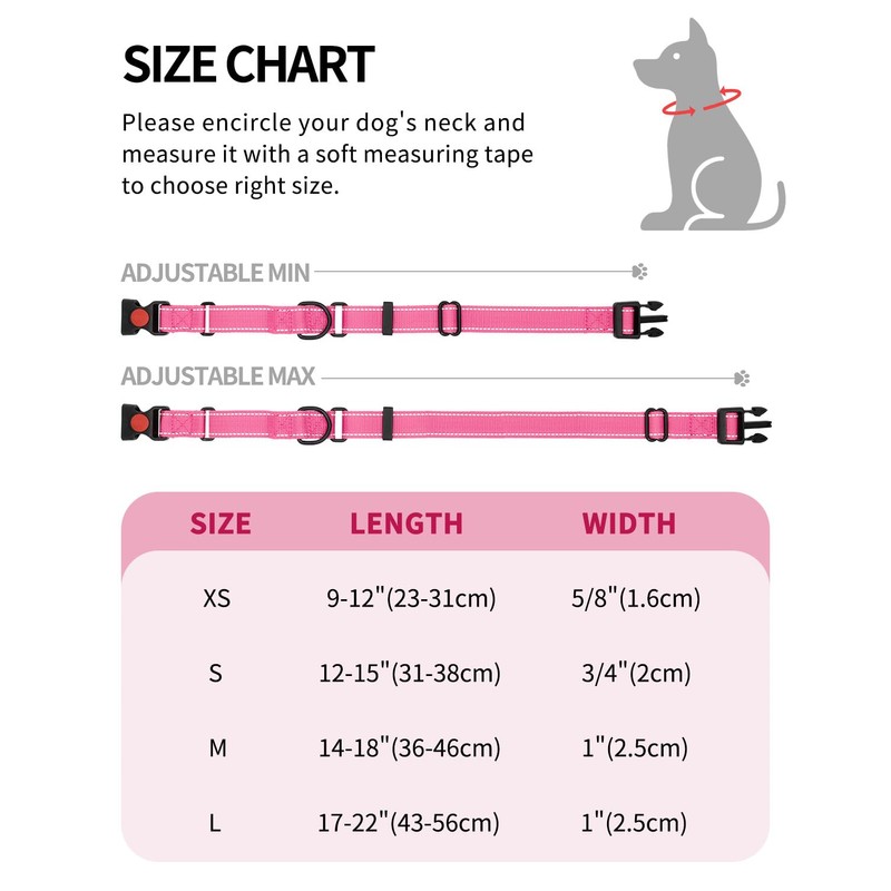 • How to choose: We offer 4 sizes:XS(23-31cm length, 1.6cm width), S(31-38cm length, 2cm width), M(36-46cm length, 2.5cm width), L(43-56cm length, 2.5cm width). Please measure your dog's neck circumference before placing your order and then refer to the size chart
