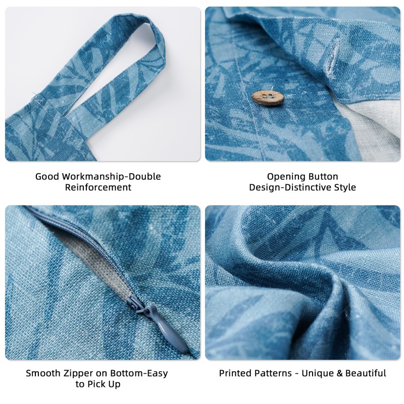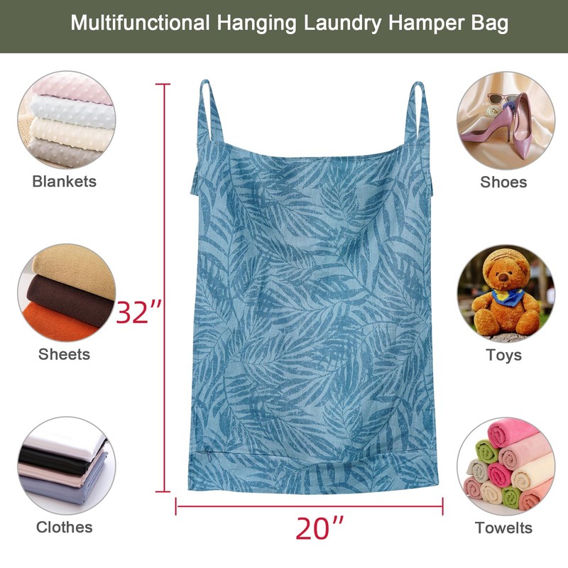 HSOFTIFY Linen Hanging Laundry Bag, 100% Linen Leaf Print Over The Door Laundry Hamper with Buttons and Zipper, Space Saving Door Hampers for Laundry Dirty Clothes Home Travel, Blue, 19.7x27.5inches