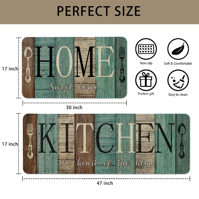 - 【KITCHEN MATS SET】Farmhouse kitchen rugs non slip washable measures 17" x 30" and 17" x 47", features 0.3" slim. One long and one small, kitchen rugs sets of 2 is just right for kitchen decor.