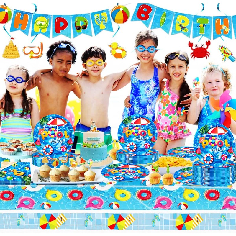 【QUICK AND EASY CLEAN UP】:These pool Party Decorations Can Save Clean up,When you're done with the tableware,just throw away the food scraps along with the tableware,save your time, just spend motime enjoying your partyre !