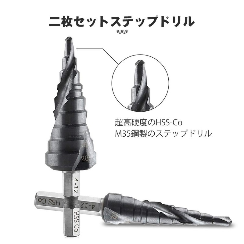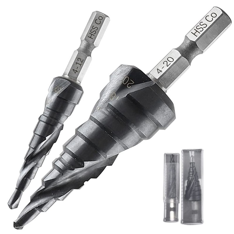 HSS-Co M35 Step Drill, Modified Version Hexagonal Drill, Set of 2, HSS-Co M35, Ultra High Hardness, 0.1 - 0.8 inches (4 - 20 mm), 9 Steps, 0.1 - 0.5 inches (4 - 12 mm), 9 Tiers, Titanium Coated Spiral, Hexagonal Spiral 2 pcs, Drilling Bamboo Shoot Drill