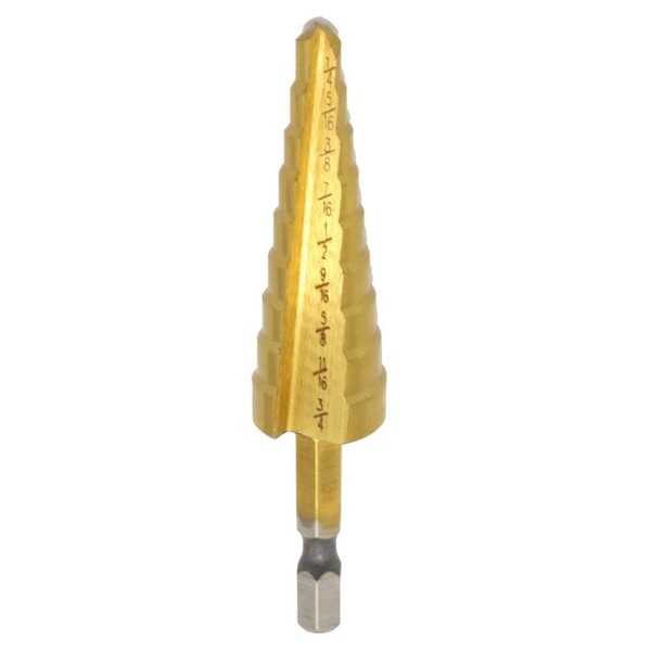 - Size:6 step drill bit: 3/16" to 1/2", 1/16" increments. 9 Step Drill Bit - 1/4" to 3/4", 1/16" increments. / 13 step drill bit: 1/8" to 1/2", 1/32" increments.