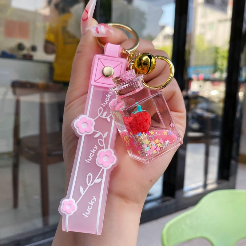 HSYHERE Girls Women Beautiful Floating Strawberry Milk Tea Cup Bubble Tea Keychain Pendant Key Ring Flower Strap, Feel Relax, Bottle, Small