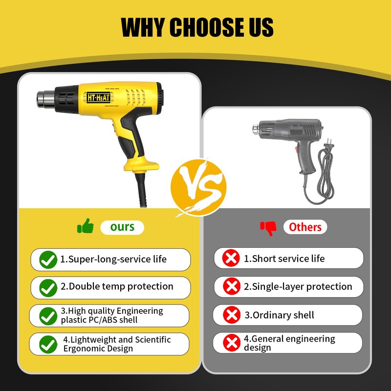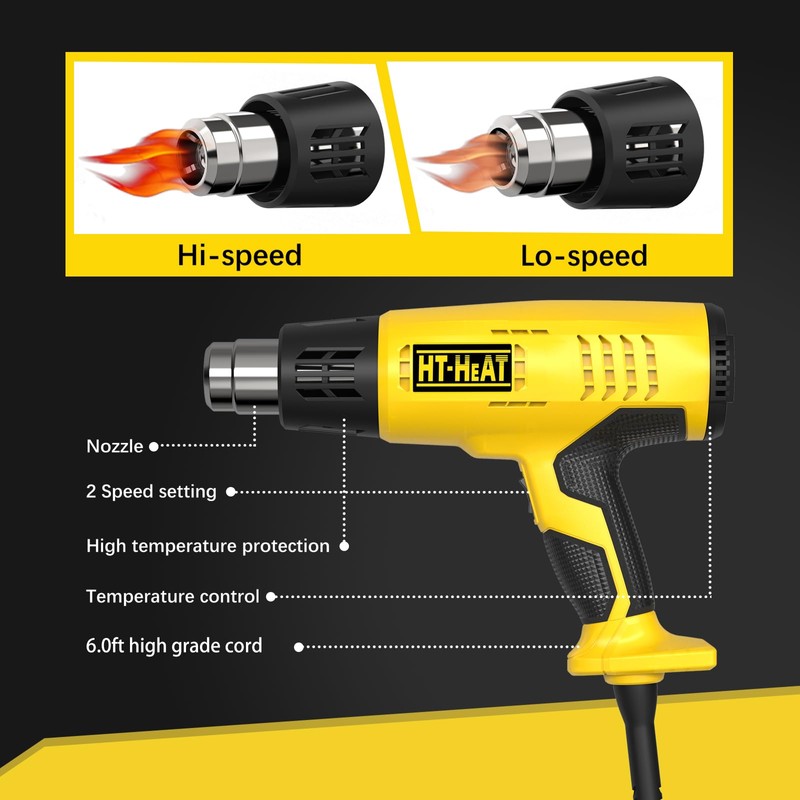 • ▶ 【Durable and Versatile Use】 HT-HEAT 1800W heat gun is made of high quality Engineering plastic PC/ABS shell, encased in special designing heater, support a product lifespan up to 1000 hours,1,800W hot air gun is useful for a variety of applications, heating fast in seconds easily to help complete DIY home improvement tasks, please pay attention to safety during use.