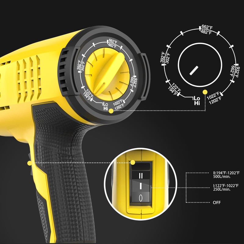 • ▶ 【Variable Temp Control & TWO Overload Protection】The Pointer dial provides the stepless Temperature range from 122℉ to 1202℉, the high / low switch on its handle provides air flow control with 250L/min and 500L/min. Temperature range from 122℉ to 1202℉; Our heat shrink gun also possess TWO overload protectors,one is overload and the other is abnormal state of affairs to avoid damaging your heat gun for vinyl wrap and circuit.