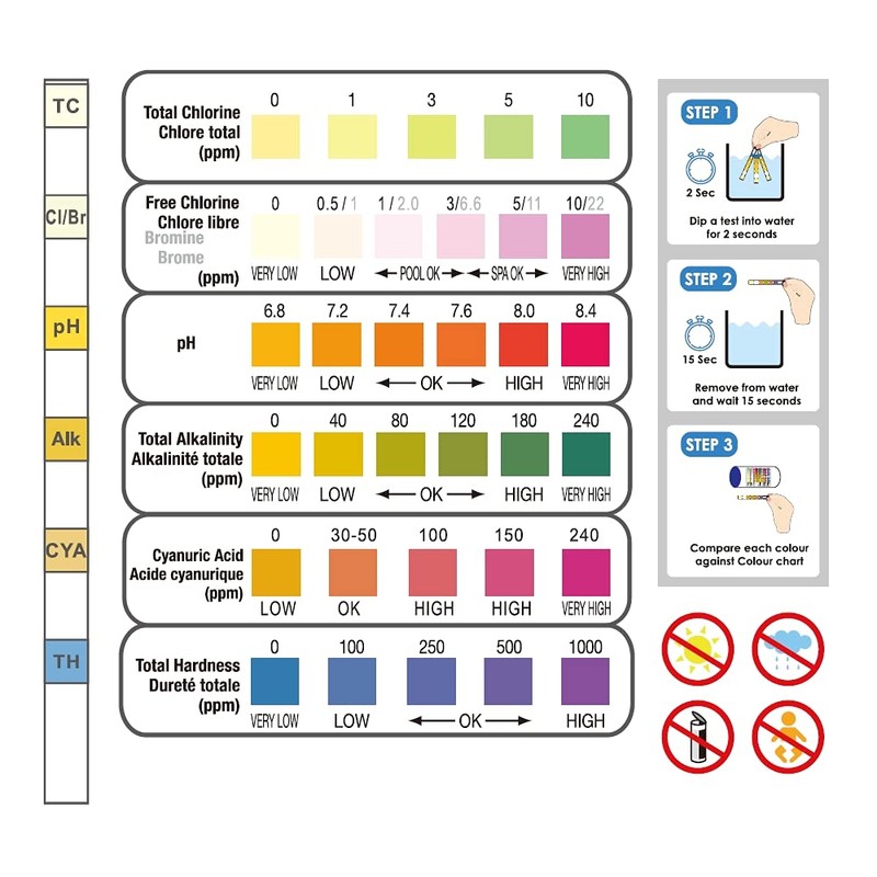 • 10 HPS test strips, 6-in-1: pH, total chloride (CL total), free chlorine/bromine (Cl / Br), alkalinity (TAC), cyanuric acid (stabilizer), hardness (TH)