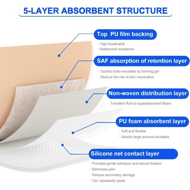 - HEAVY ABSORPTION, FEWER CHANGES: The thick foam core rapidly absorbs and locks away large volumes of exudate. This high-capacity silicone foam dressing 4x4 stays securely in place much longer than traditional gauze, requiring fewer changes C perfect for daily life and clinical wound care.