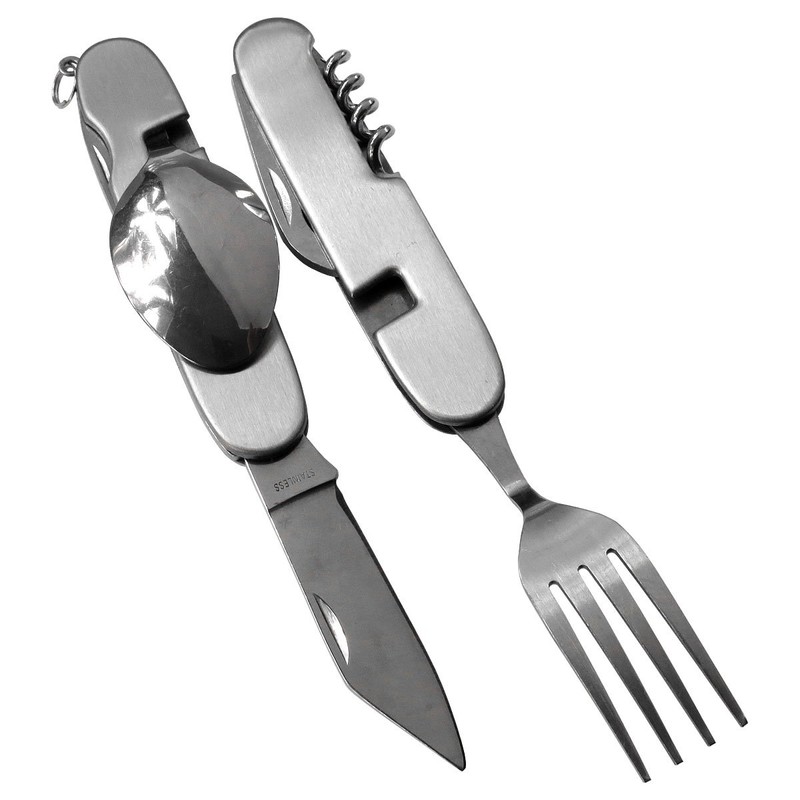 - Features a fold out spoon, fork, knife, bottle opener, can opener, and reamer
