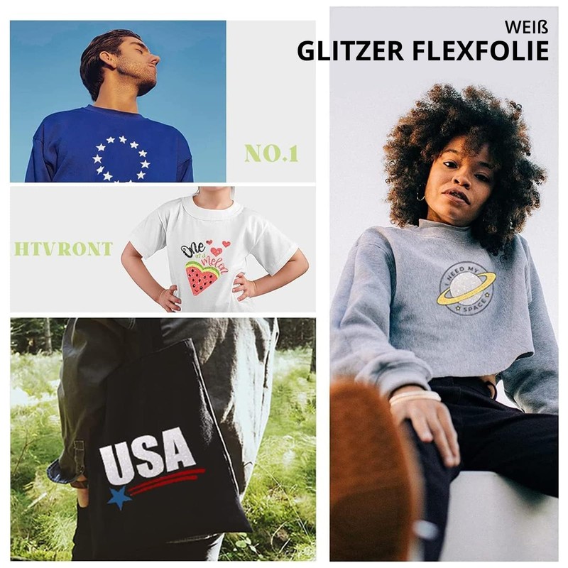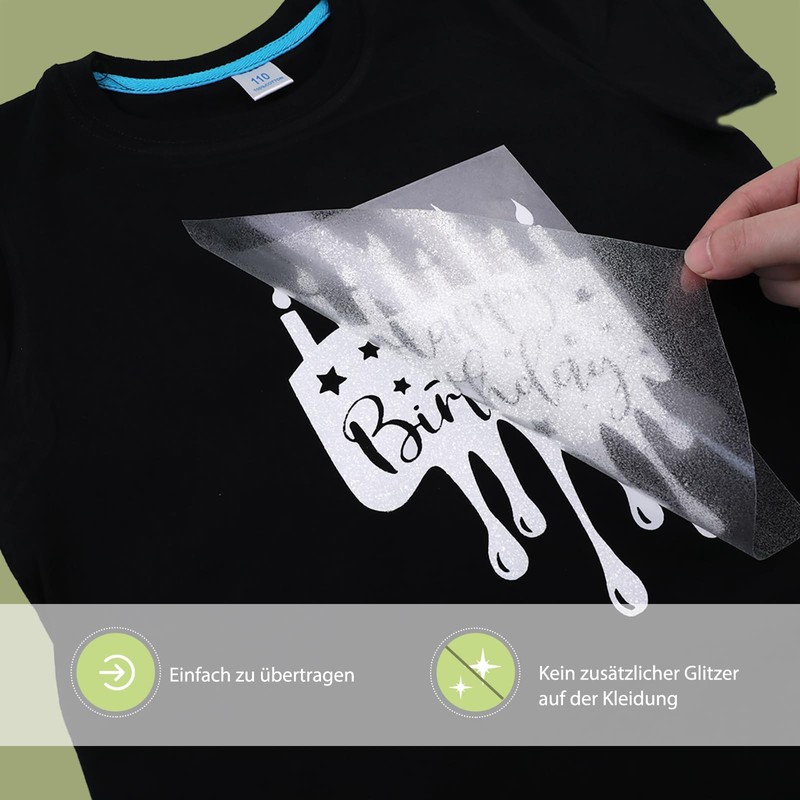 - Glitter that does not fall off: White glitter plotter film Texti is made of high-quality materials and coated with colourful, fine glitter to make your designs sparkle and shine. The white glitter iron-on vinyl is durable. There is no excess glitter on your clothes and it will not peel off except from your design. Our glitter heat transfer film is not only perfect for glitter heat transfer film, but also can be used for sublimation.