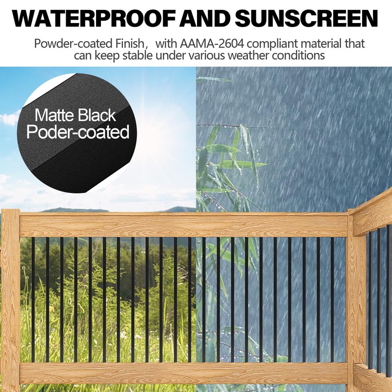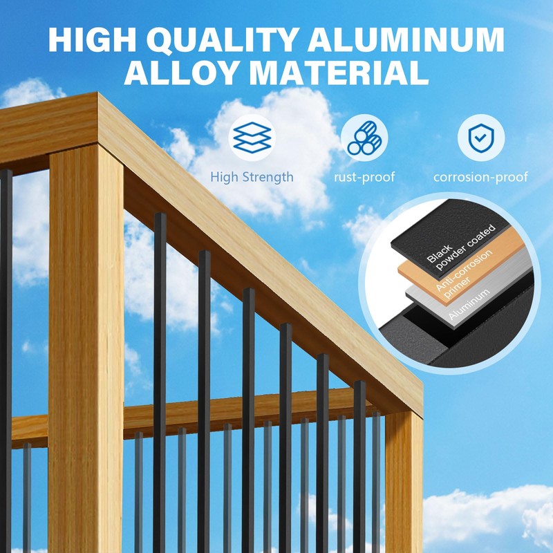 - HIGH QUALITY MATERIAL: Our 26" square deck balusters are made of high quality aluminum that is extremely rust resistant, long lasting and suitable for various weather conditions. The surface is powder coated in accordance with AAMA-2604, allowing the railings to produce a uniform, durable, high quality finish that is also environmentally friendly. It is ideal for both indoor and outdoor applications, require no maintenance.