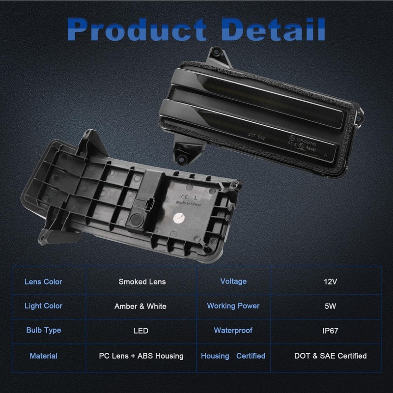 • 【Function】LED side mirror light feature high-power LED chips with dual-color switching, the bright lights improve visibility and safety at night. Amber Dynamic Sequential turn signal light and white daytime running parking lights balance practicality and aesthetics.