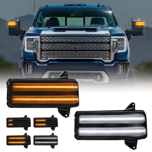 HTZCMOTO LED Side Mirror Turn Signal Light Compatible with Silverado/Sierra 2500HD 3500HD 2020-2024, Dual-Row Amber LED Dynamic Sequential Turn Signal Light White Parking Light, Smoked Len